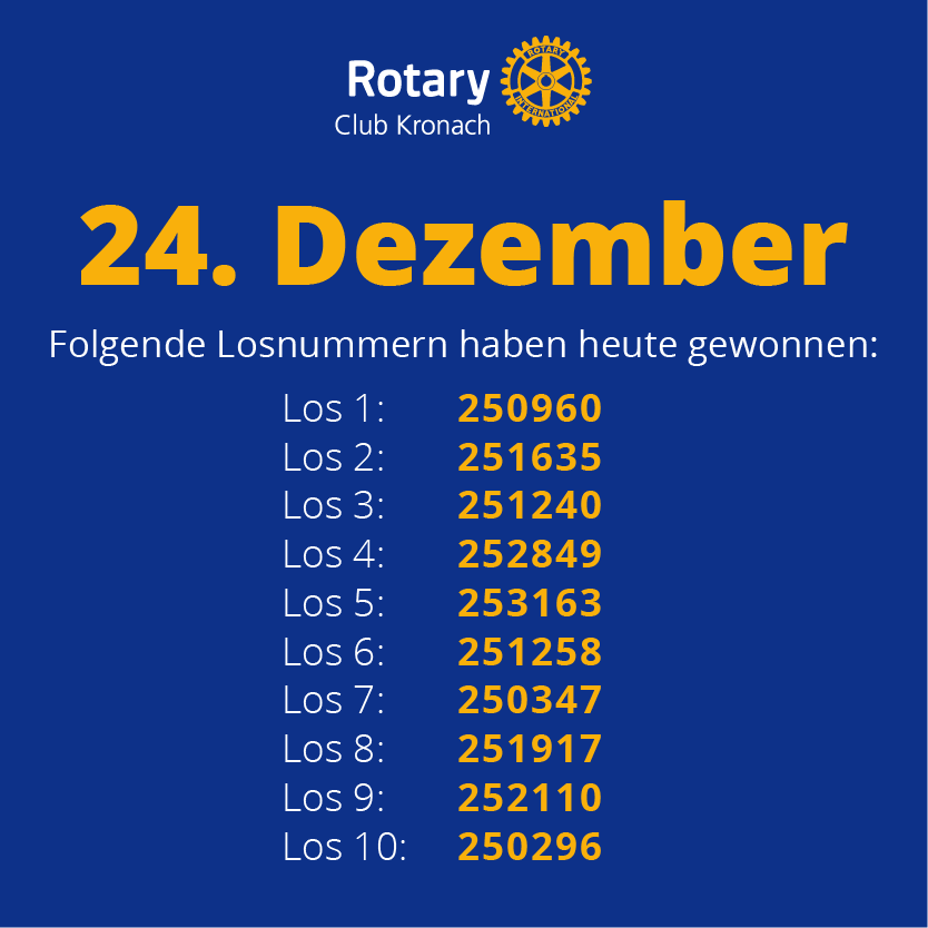 Ihr Adventskalender-Los hat eine einmalige Losnummer. Mit dieser Losnummer nehmen Sie an der täglichen Ziehung der Preise, Gutscheine und Waren von Sponsoren aus Kronach und dem Umland teil – 24 Tage lang oder bis Sie gewonnen haben. Jede Los-Nummer kann nur einmal gewinnen.
